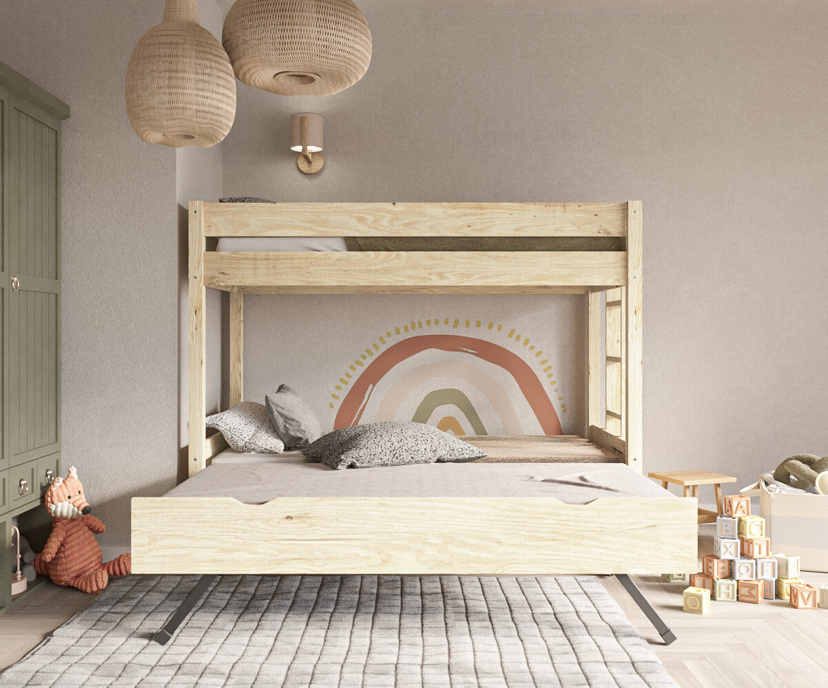 Ce lit superposé est modulable, il inclut un sommier gigogne, optimisant l'espace sous le sommier et offrant un troisième couchage confortable. Vous obtenez ainsi un lit simple en haut et un lit double en bas. Si vous le souhaitez, vous avez la possibilité de séparer les couchages pour mettre le sommier gigogne dans une autre pièce par exemple. Un véritable gain de place !
