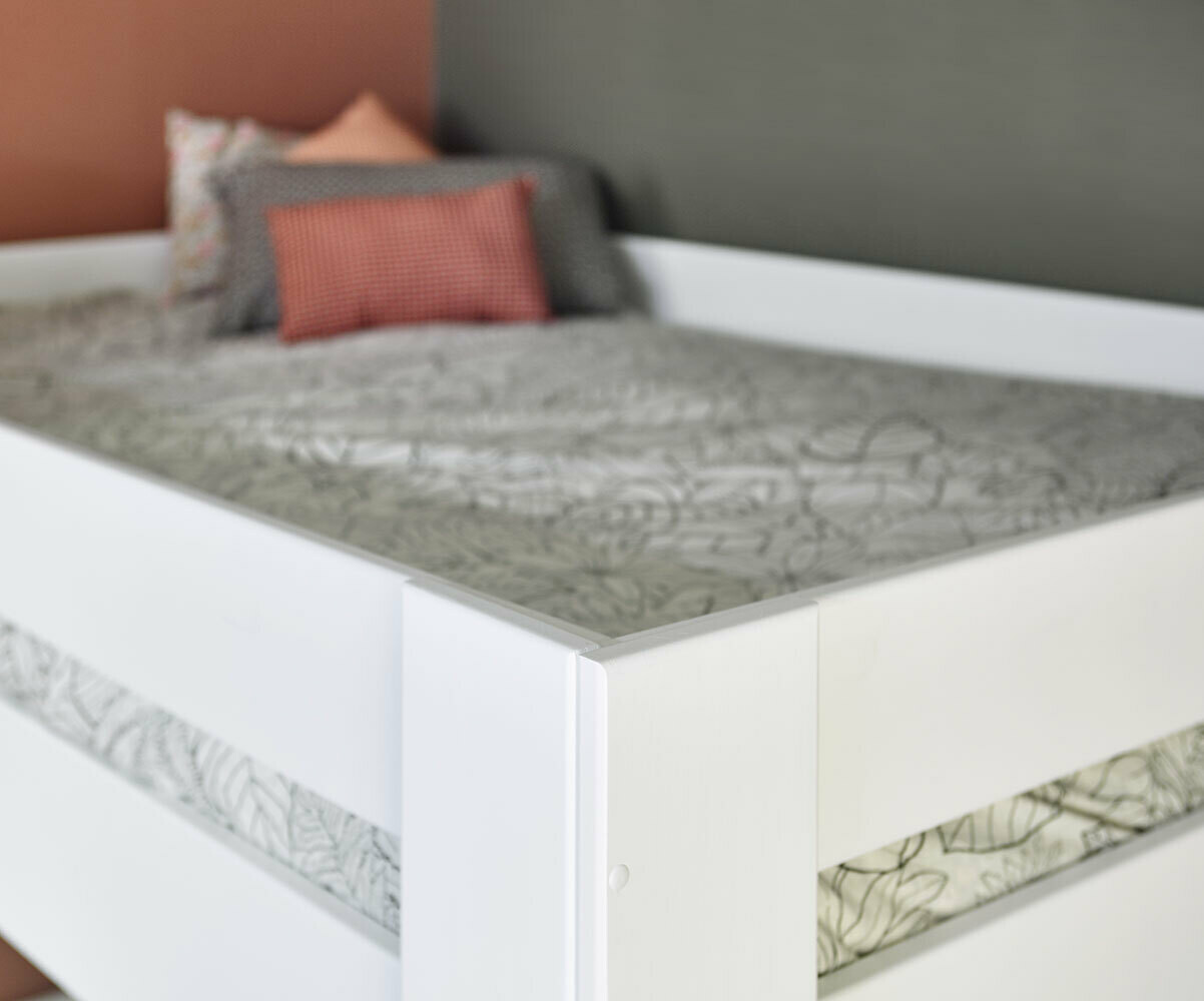 Il ne vous reste plus qu’à compléter le couchage par un matelas de la même taille que le couchage choisi, avec une hauteur maximale de 18 cm. La hauteur entre le sommier et le haut de la barrière de sécurité est de 32,2 cm.