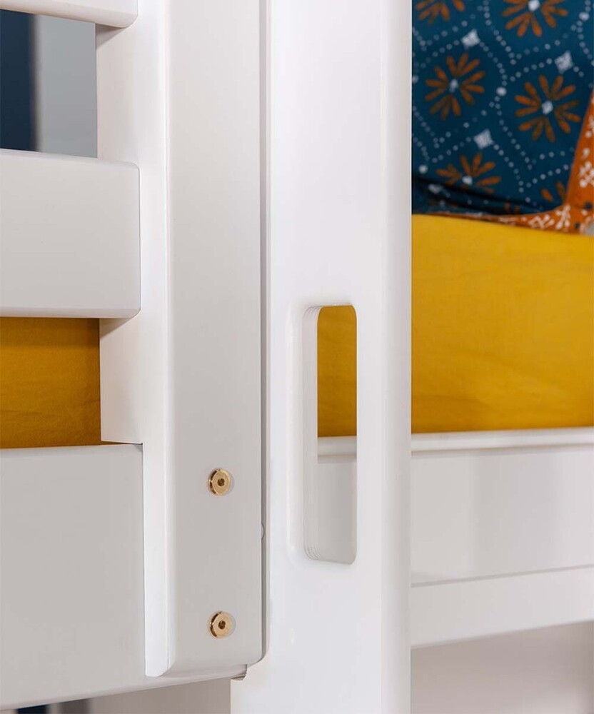 Pour les versions 90x190 et 120x190 cm, le lit mezzanine Decan est équipé d'une échelle droite, alors que la version 2 places 140x190 cm est accessible par une échelle oblique. Cette échelle est positionnable sur les 4 côtés du lit, pour un accès facile et sécurisé. De plus, les larges marches et les poignées facilitent la montée et la descente du lit.