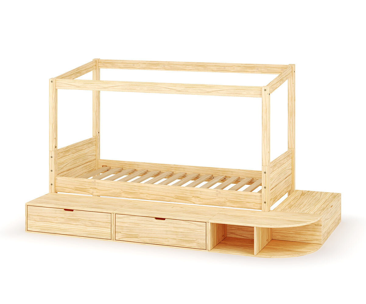 L'astucieuse estrade de rangement du Combeebed révolutionne l'organisation de la chambre. Les deux grands tiroirs coulissants et le coffre intégré offrent un espace de stockage généreux pour les jouets, les livres et la literie. Les niches de rangement ajoutent une touche décorative tout en maximisant l'utilisation de l'espace. La structure en pin massif, associée au sommier à lattes robuste, garantit une stabilité optimale pour des nuits paisibles.