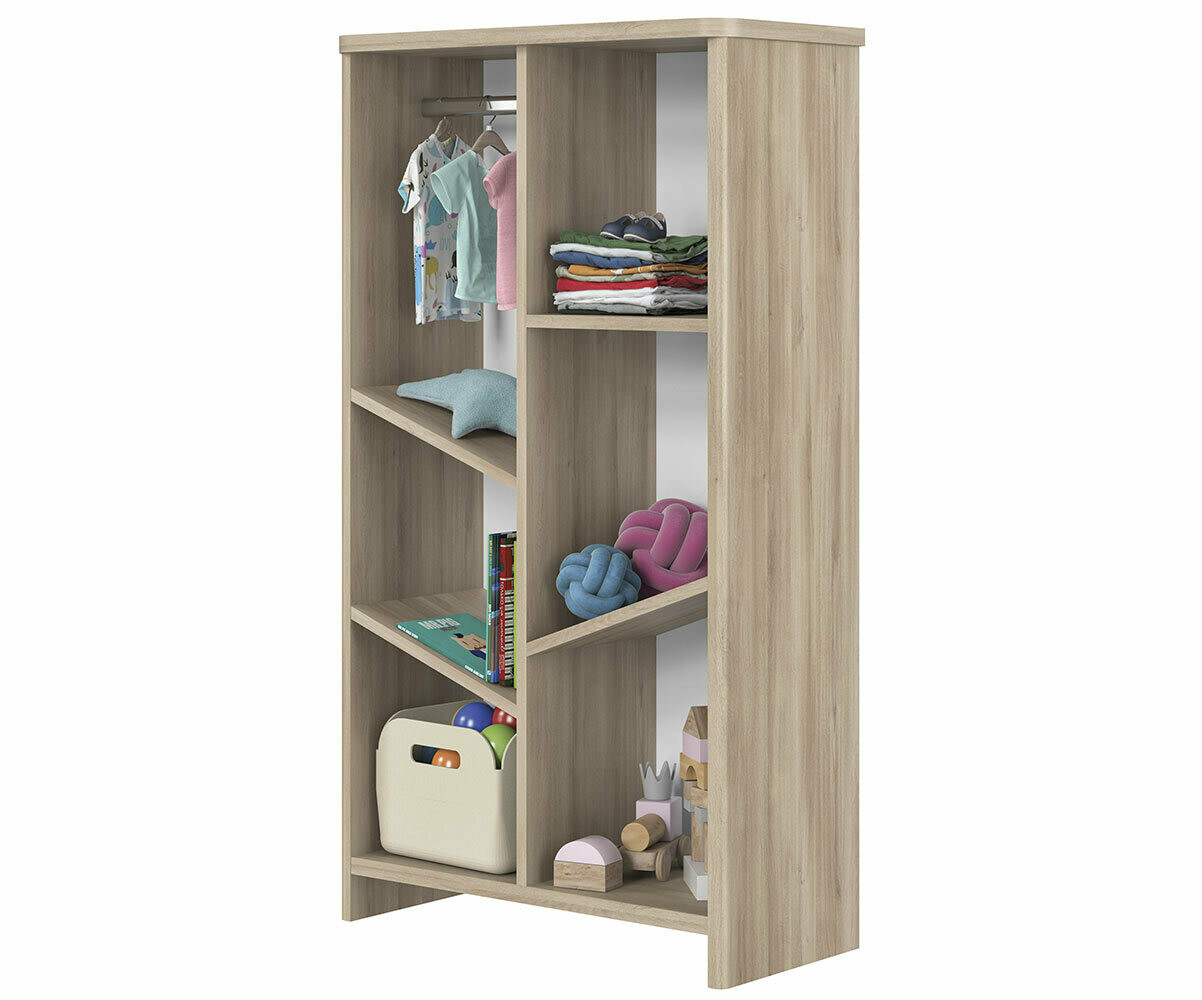 La bibliothèque Lili dispose d’une petite penderie (1 tube), de 3 tablettes obliques et d’une tablette droite, délimitant ainsi 6 espaces de rangement. Elle peut se placer derrière la commode bébé Lili pour agrandir la capacité de rangement. Elle vous permet dans ce cas d’avoir à portée de main tout le nécessaire pour le change de bébé : produits de toilette, tenues de rechange, etc …