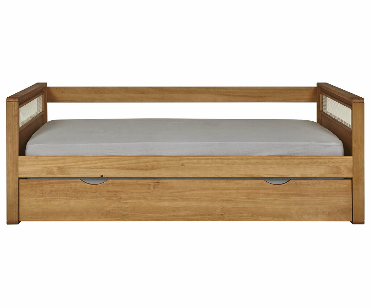 Fabriqué en bois de pin massif, le lit gigogne banquette Houane est disponible en 2 dimensions : 90x190 cm et 90x200 cm. Il est constitué d’un couchage principal doté d’un sommier de 14 lattes en pin massif et d’un couchage dissociable composé d’un sommier à cadre métallique. Grâce à ses pieds relevables, le sommier gigogne se positionne à même hauteur que le couchage principal et votre ado peut ainsi disposer d’un lit 2 places pour accueillir ses amis pour la nuit.