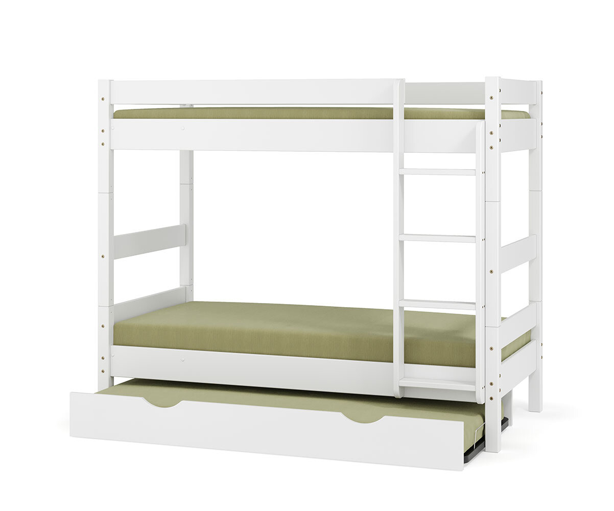 Le lit superposé est la solution de couchage plébiscitée lorsque plusieurs personnes doivent cohabiter dans une même pièce et que celle-ci ne dispose pas d'une grande superficie. Ses 2 couchages superposés vous permettent en effet de libérer de l'espace dans la pièce. Vous pouvez alors disposer, selon vos besoins, un espace de travail ou des meubles de rangement. Avec le sommier gigogne escamotable, le lit superposé Wood dispose de 3 couchages. Le troisième couchage est un sommier gigogne qui se glisse sous le lit inférieur. La journée, il libère l'espace et au moment où vous en avez besoin, il vous suffit de le tirer, grâce aux 2 passe mains intégrés. Vous pouvez ensuite le laisser au sol pour créer 2 couchages indépendants ou le monter au niveau du sommier du lit inférieur pour former un couchage double. Il est dissociable de la structure, vous pouvez même l'installer dans une autre partie de votre habitat.