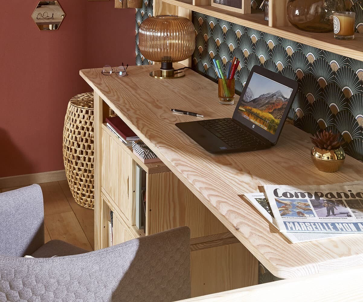 Le lit mezzanine Naolo et le bureau Rimi sont intégralement fabriqués en bois massif.