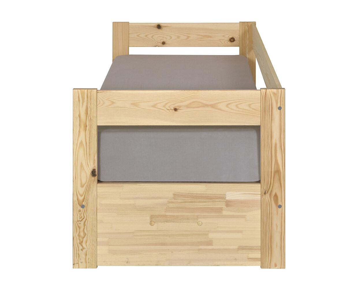 Par ailleurs, grâce à son tiroir de rangement d’une capacité de 130 à 150 L, vous pouvez aisément y faire disparaitre couette, draps et oreillers. Monté sur roulettes, fabriqué en sapin massif, à l’exception du fond qui lui est en panneaux de fibres, le tiroir de rangement affiche des dimensions 178 x81,5 cm pour une hauteur de 19,7 cm.