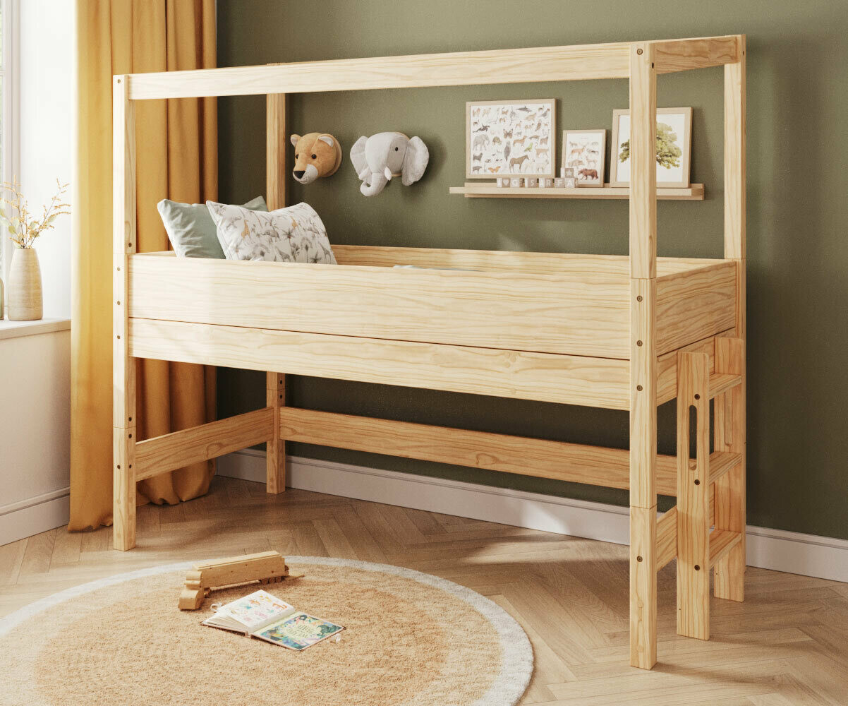 Le lit enfant mezzanine mi-hauteur Combeebed représente le parfait équilibre entre sécurité et imagination. Sa structure surélevée en pin massif avec barrières de protection antichute offre un couchage enfant confortable et sécurisé, accessible par une échelle positionnable sur la longueur ou la largeur du lit. L'espace sous le lit devient une véritable aire de jeu que votre enfant peut personnaliser à l'infini. Grâce au sommier à lattes et au matelas haute densité inclus, ce lit cabane garantit des nuits paisibles tout en stimulant la créativité de votre petit aventurier.