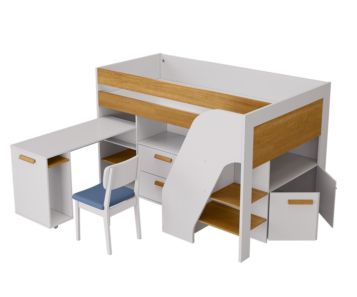 Profitez d’un couchage gain de place avec le modèle mi-hauteur Auckland : lit 90x200 cm, meubles de rangement et bureau rétractable. L’indispensable pour une chambre enfant optimisée !