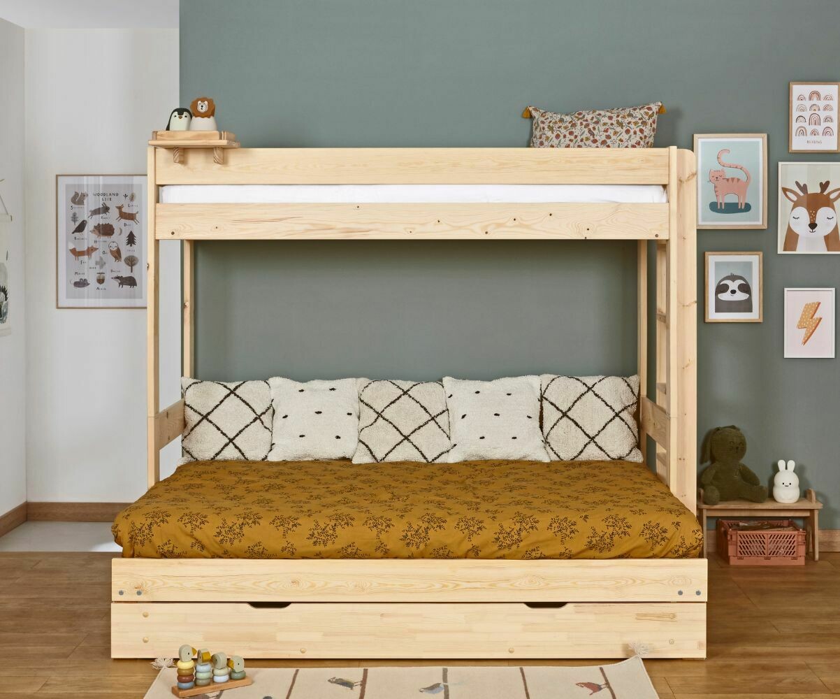 Grâce à son ingénieux système de lit gigogne peigne, ce lit superposé vous offre trois couchages confortables qui, lorsque le lit gigogne est replié prennent la place d’un lit simple de 80x200 cm.