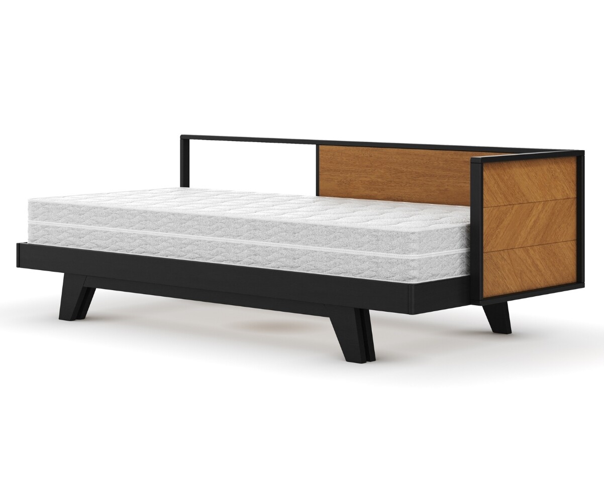 La structure du lit Clife, fabriquée en bois de pin massif, assure robustesse et durabilité, tout en apportant une touche naturelle et chaleureuse à votre décoration intérieure. Le coloris moderne noir et noisette, agrémenté d’un motif chevron sur le côté de la banquette, confère à ce lit une esthétique raffinée, parfaitement adaptée aux intérieurs contemporains ou au style scandinave. Que vous l'utilisiez dans une chambre d’adolescent, un studio ou un salon, le lit Clife s’intègre avec élégance tout en vous offrant une flexibilité maximale en matière de couchage.