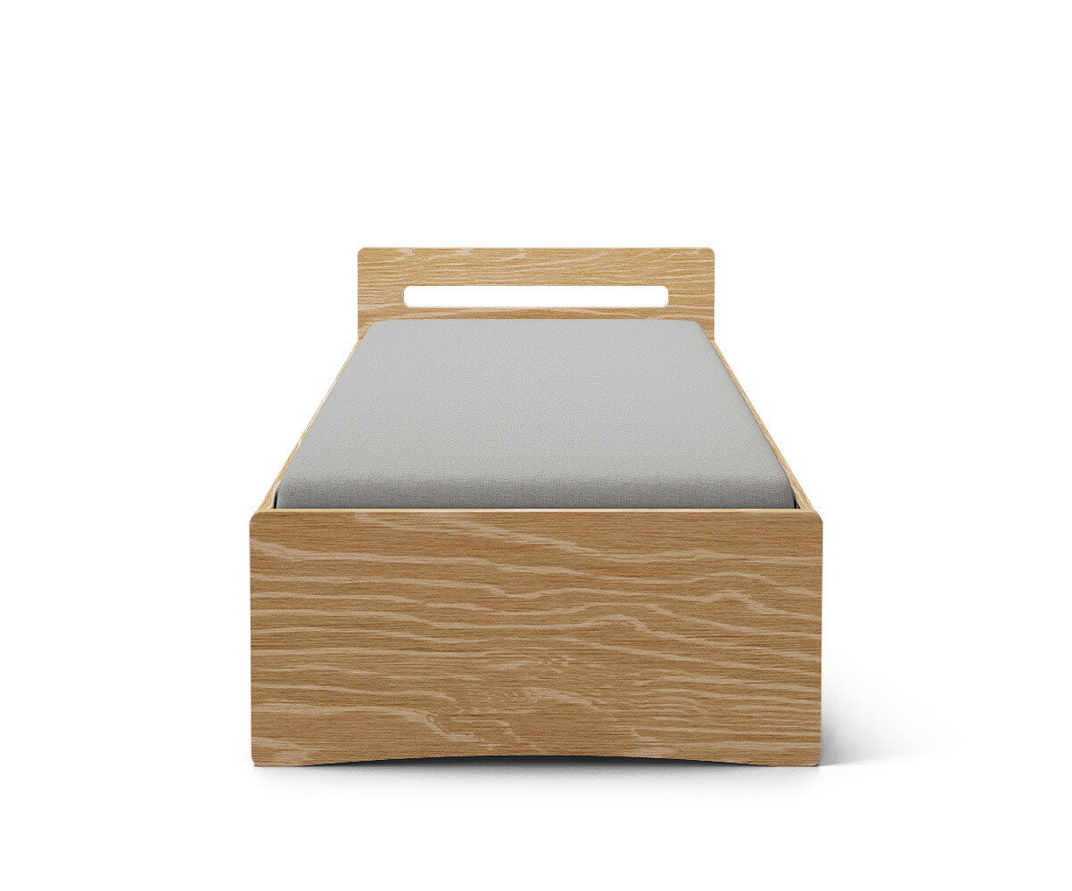 Un lit adulte simple avec cadre de lit, sommier et tête de lit en bois massif
