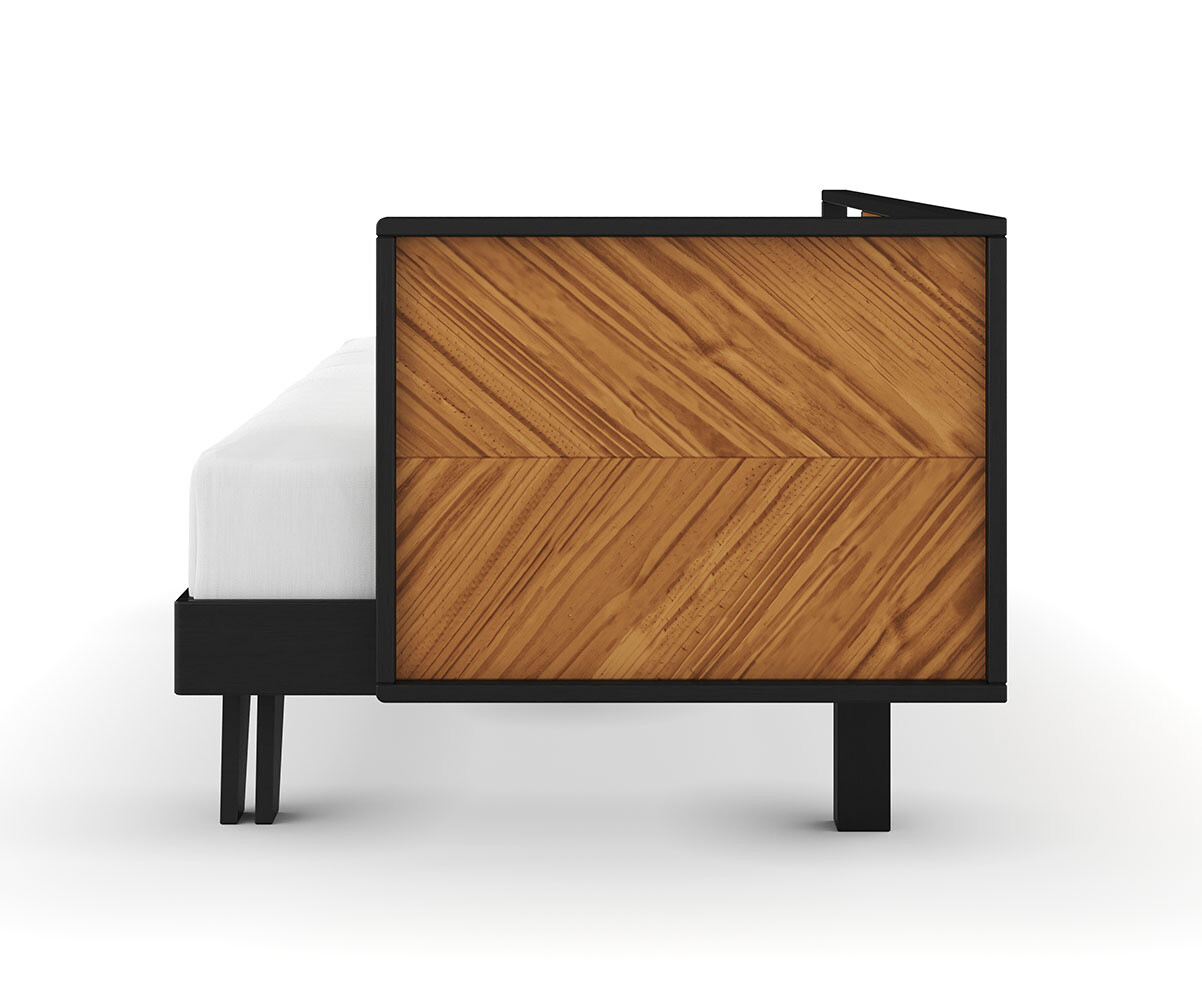 Le design du lit gigogne Clife s’intègre parfaitement dans les intérieurs modernes grâce à son coloris noir et noisette, qui ajoute une touche de sophistication à la pièce. Le motif chevron sur le côté de la banquette apporte un détail raffiné au meuble.