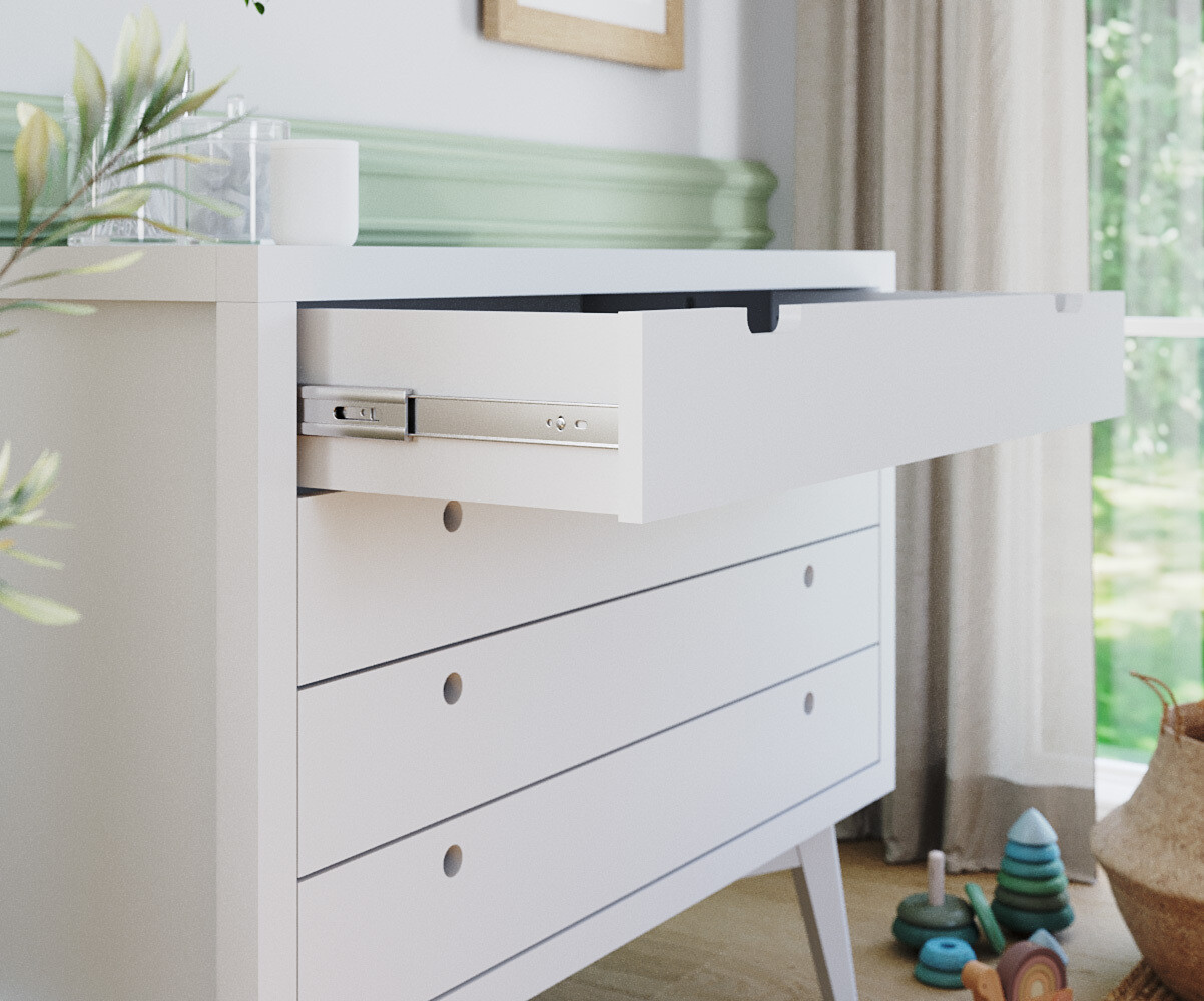 La commode à langer est un mobilier 2 en 1 pour à la fois changer bébé et ranger toutes ses petites affaires. Dotée de 4 grands tiroirs de dimensions 97 x 39 x 18 cm, la commode vous permet d’avoir sous la main tout le nécessaire pour changer et habiller votre bébé sans vous déplacer.