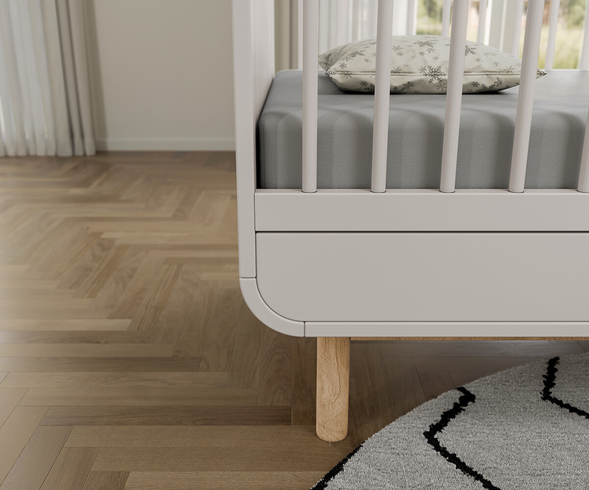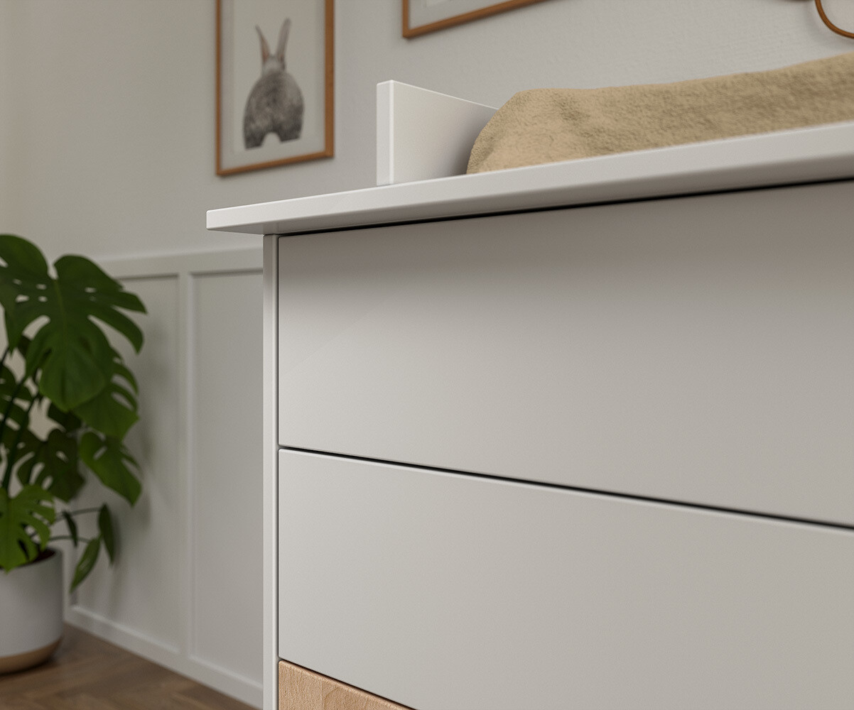 La chambre bébé Kinona convient aussi bien aux petites filles qu'aux petits garçons. Aussi délicate qu'authentique, elle est harmonieuse et convient parfaitement aux adeptes du style naturel et des ambiances épurées. Vous disposez de meubles de haute qualité, solides, robustes et résistants. Quand votre bébé deviendra un jeune bambin, il pourra compter sur du mobilier stable qui prend soin de sa sécurité. La structure des meubles de la chambre Kinona est en panneaux de fibres de bois. En revanche, les pieds du lit et de la commode sont 100 % bois de hêtre massif. C'est aussi le cas des barrières du lit évolutif. Concernant la sécurité de votre petit protégé, vous pouvez avoir l'esprit tranquille. Le lit bébé est conforme à la norme EN 716-1 :2017+AC:2019, tandis que le plan à langer respecte scrupuleusement la norme EN 12221-1:2008+A1:2013. Vous faites le choix d'une chambre confortable, en parfait accord avec les normes de sécurité en vigueur.