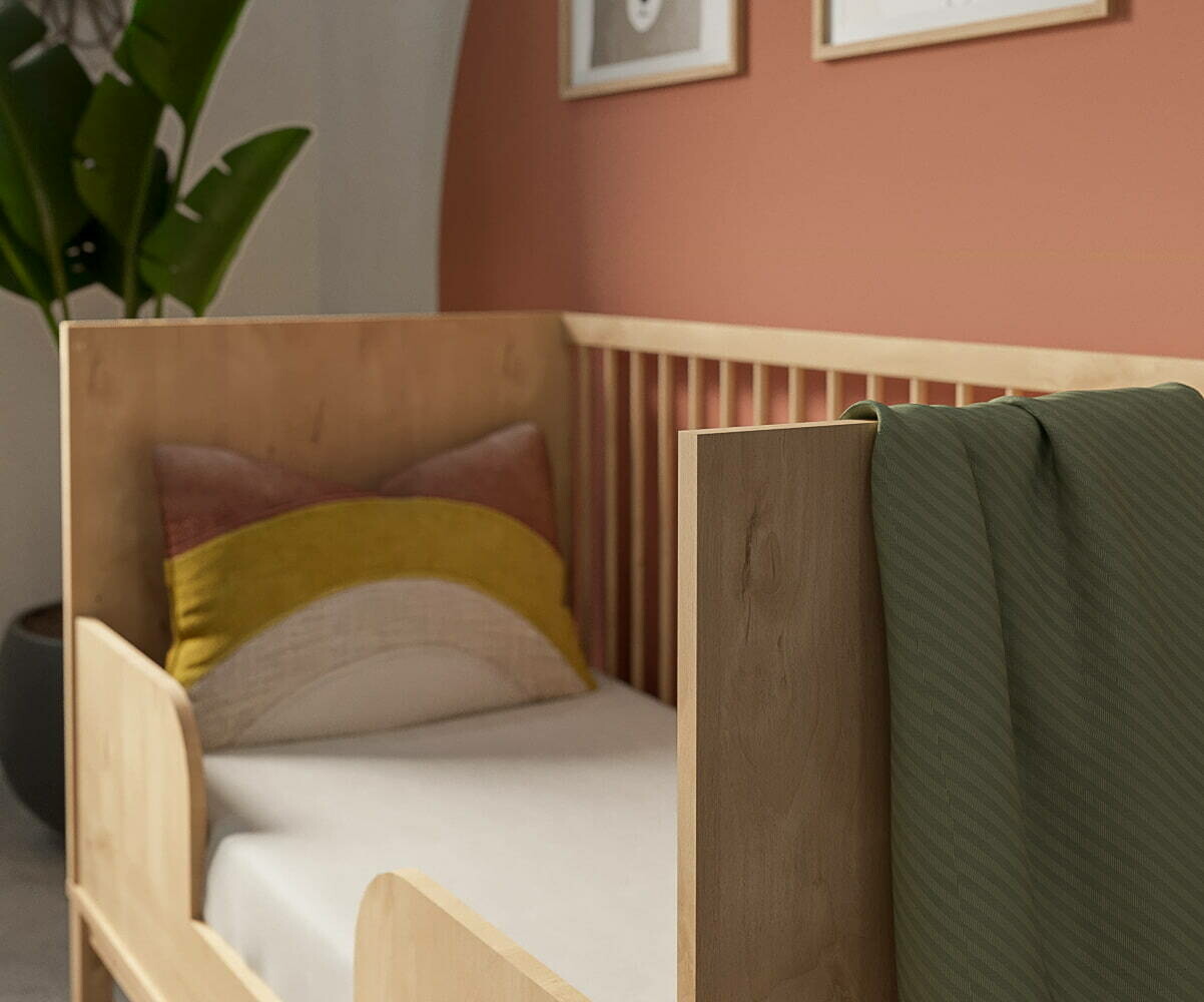 Il est à noter que pour le lit bébé, la teinte des barreaux en hêtre est légèrement plus claire que celle des panneaux de bois sur les côtés.