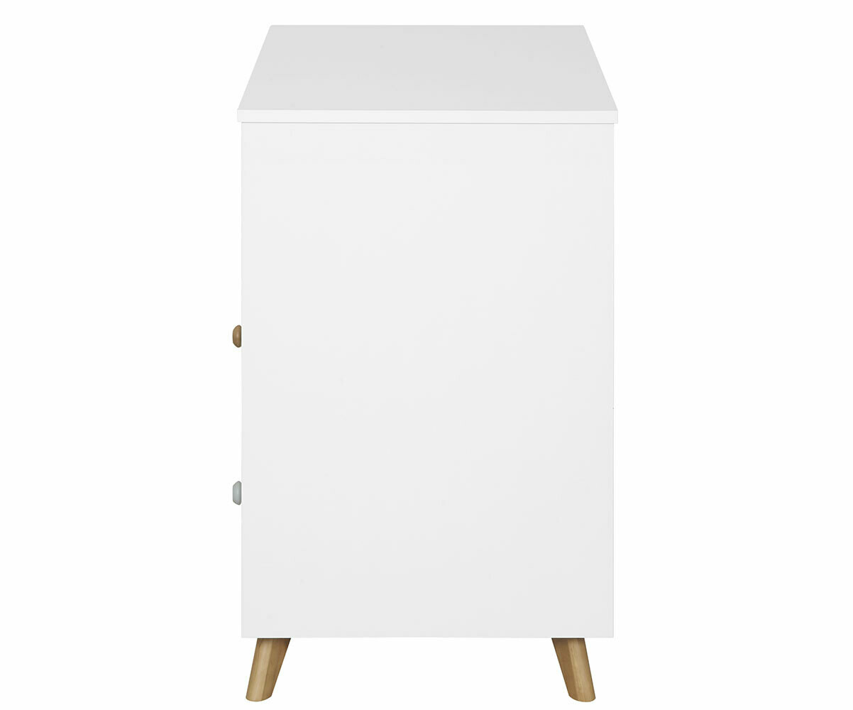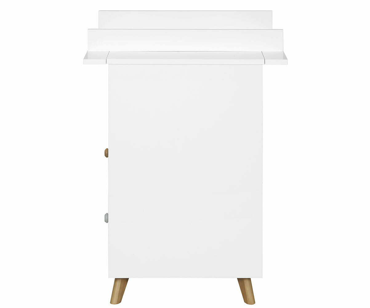 La commode bébé Pepper est équipée d'une structure en panneaux de bois avec un décor blanc et de pieds fuselés en bois massif.