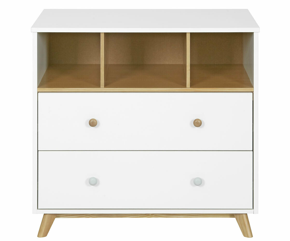 Avec ses 2 tiroirs, la commode dispose d’un grand espace de rangement. La commode possède aussi 3 niches dans lesquels vous pouvez glisser des paniers en tissu et ranger des produits de soins, des jouets ou des livres. Les 2 tiroirs sont sur coulisses à freins pour plus de sécurité. Ce qui évite les petits doigts coincés !